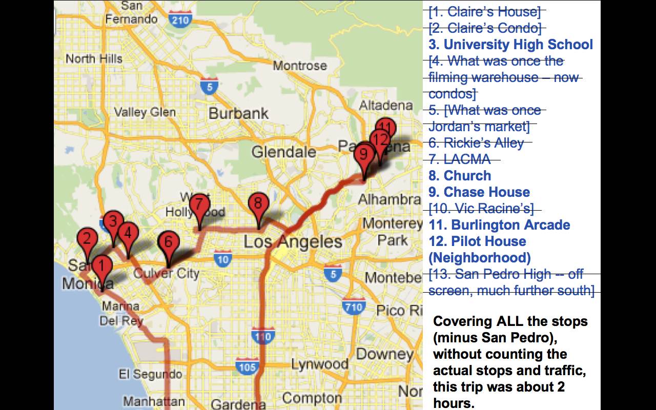 Re: Los Angeles * Summer 2012Thanks (so much!) to IAMNOTASTALKER.com I mapped out a route covering the known shooting /related locations for the show (some of which are now defunct; others seem like an invasion of privacy, or not really worth a stop if time is limited).